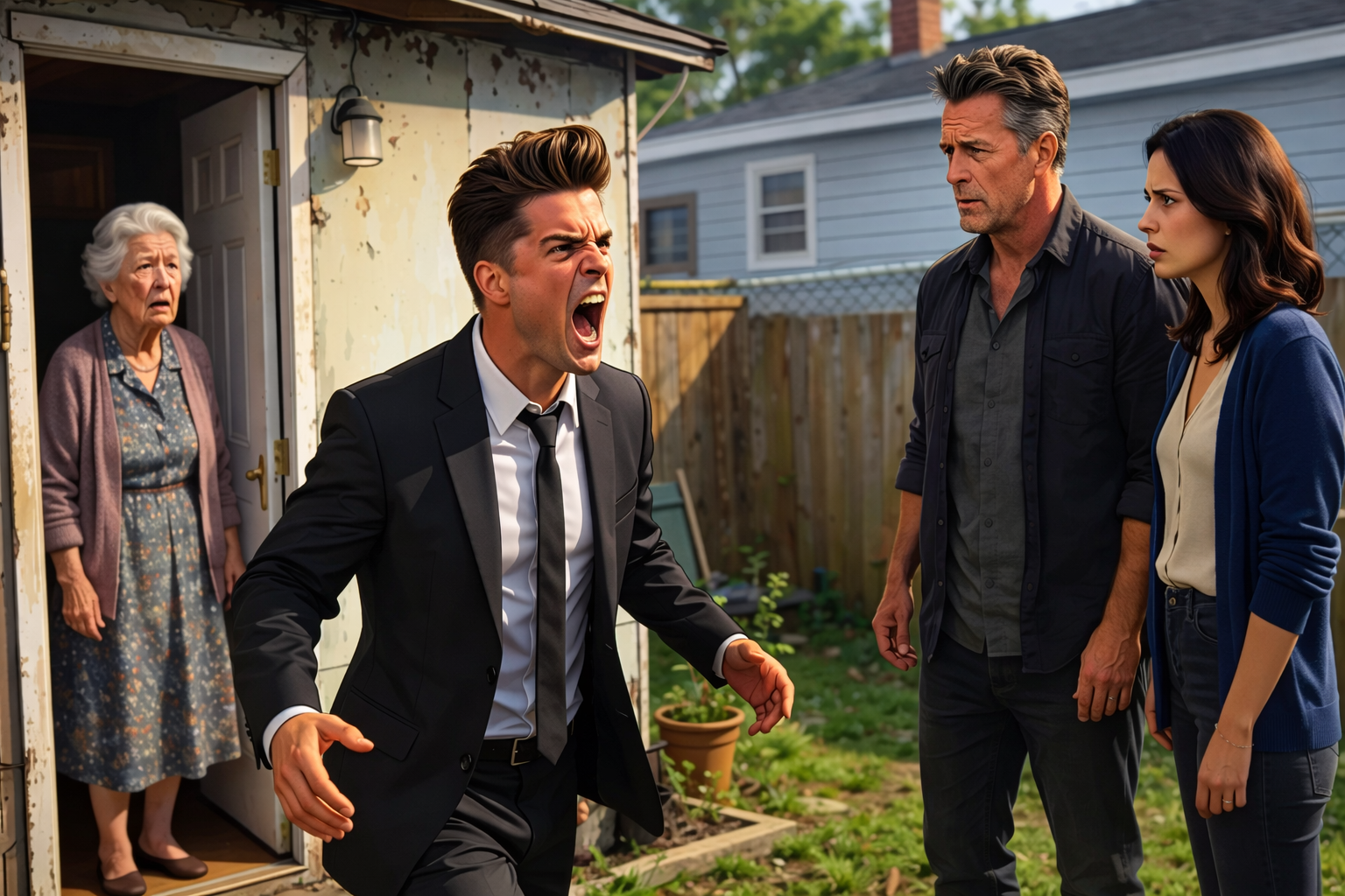 Before I could answer, the kitchen door from the main house slammed open. Brian strode across the yard, jaw already tight, with his wife Melissa behind him, arms crossed and wearing that permanent look of offense she carried whenever life didn’t revolve around her comfort.