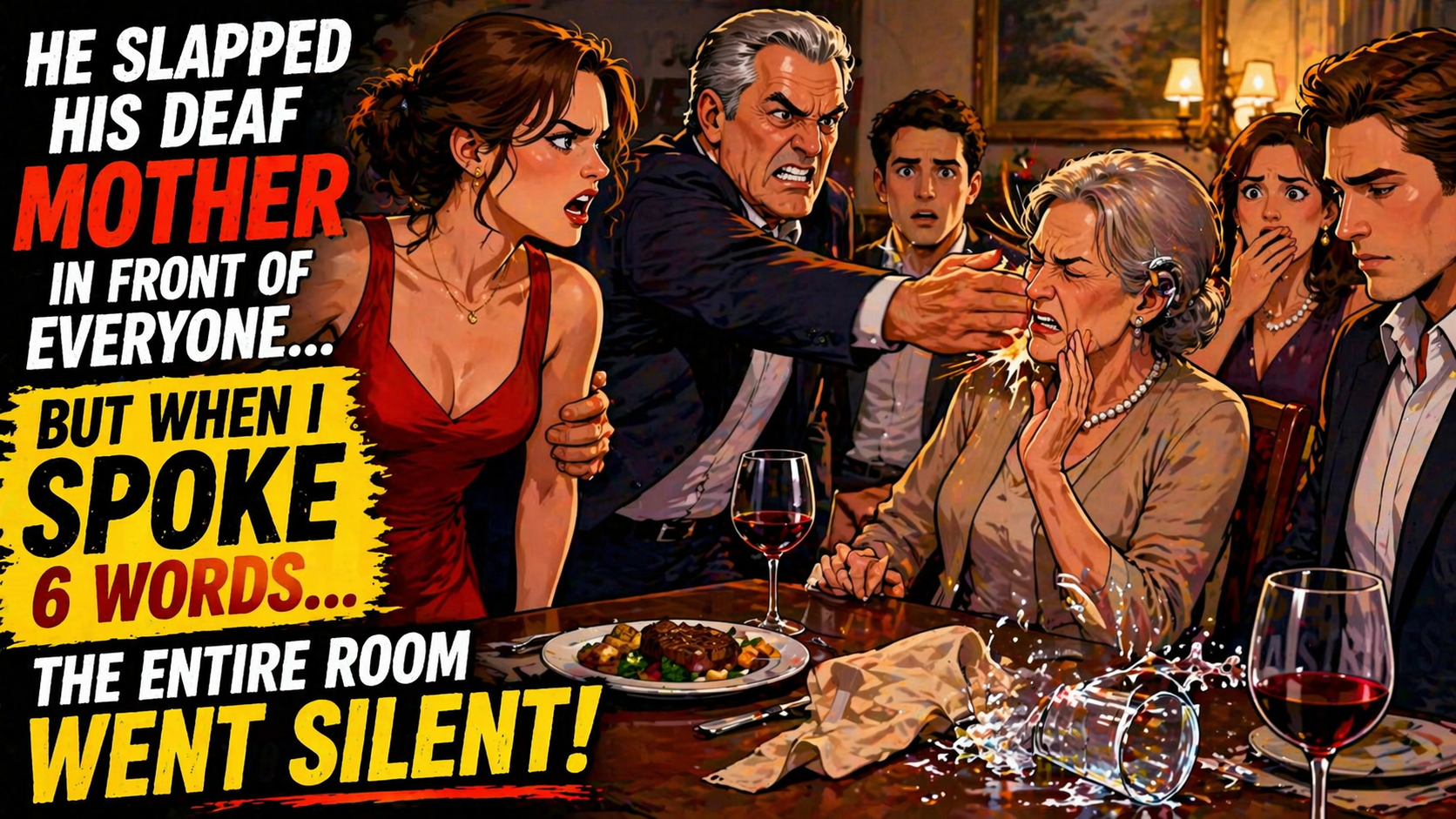One moment, his mother was reaching for a cloth napkin, her hands unsteady. The next, his father’s palm had already connected with her face, snapping her head to the side. Her hearing aids shrieked with feedback. A glass tipped, rolled, and shattered across the hardwood floor.