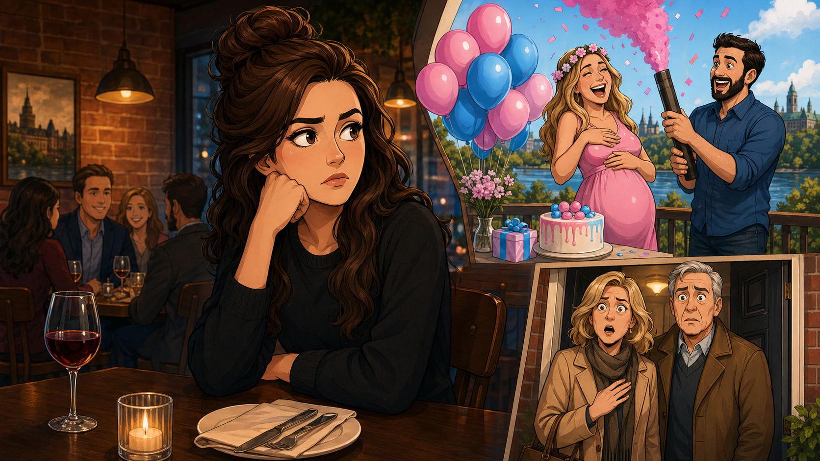 Juste : « Écoute, petit souci. On a réservé la révélation du sexe pour samedi, et honnêtement, ce serait probablement plus simple si tu décalais ton dîner. Maman et Papa veulent avoir le week-end entier de libre. »