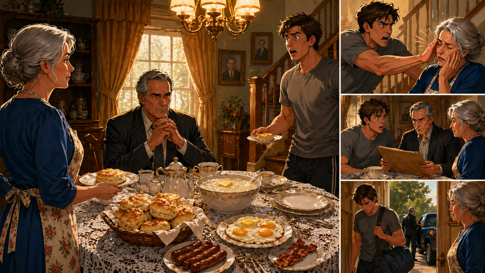 PARTIE 1 : La nuit dernière, mon fils m’a frappée, et je suis restée silencieuse. Ce matin, j’ai sorti la nappe en dentelle, préparé un somptueux petit-déjeuner du Sud, et dressé la table avec la plus belle vaisselle comme si c’était Noël. Il est descendu, a vu les biscuits, le porridge et le café, a souri avec ce même air suffisant qui autrefois me faisait peur, et a dit : « Enfin, maman, tu as appris ta leçon… » mais son expression a instantanément changé lorsqu’il a vu la personne assise à la table, le dossier brun, et le secret que mon défunt mari avait laissé derrière lui.