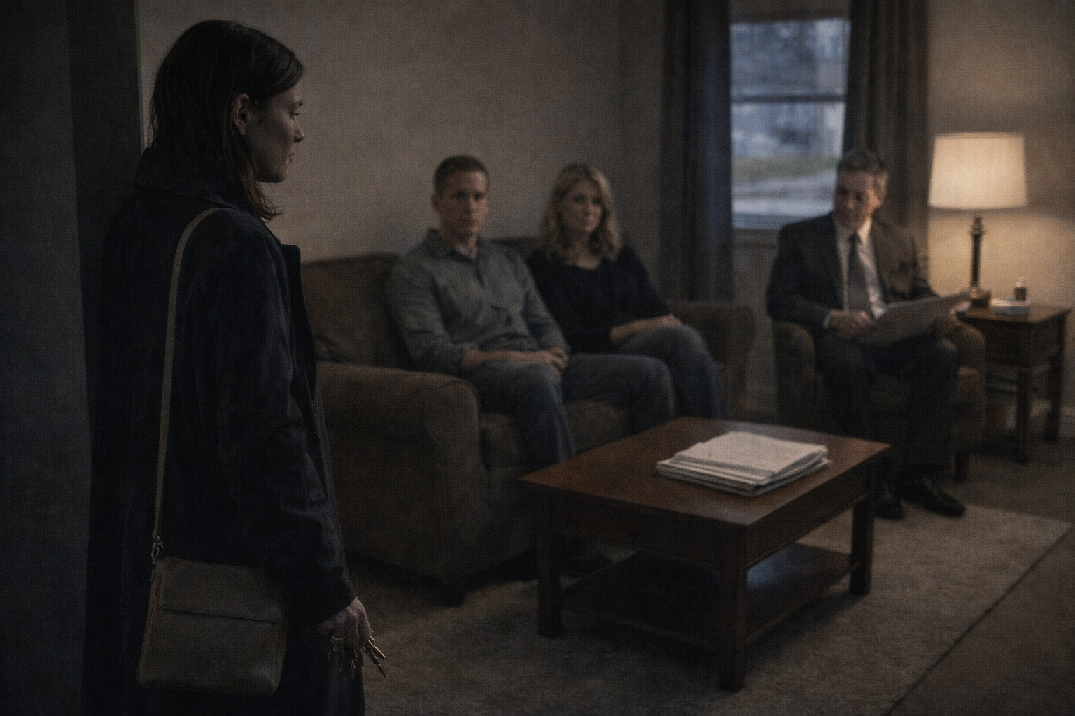 On the coffee table sat a neat stack of papers, arranged like they’d rehearsed this moment in the car on the way back from the cemetery.