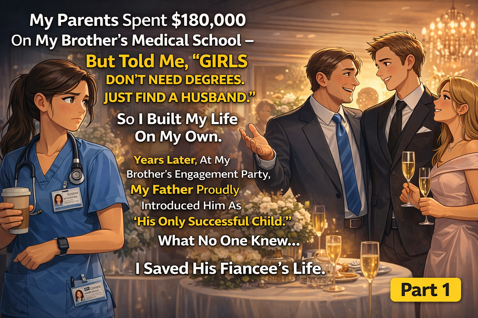 Fifteen years later, at my brother’s engagement party, my father stood in front of two hundred guests and called my brother “our family’s greatest achievement”—not knowing that the bride standing beside him was my former patient. The same patient whose life I’d saved three years ago during an emergency surgery that lasted nine hours.